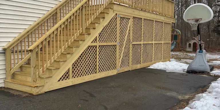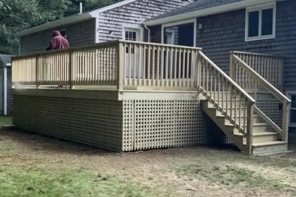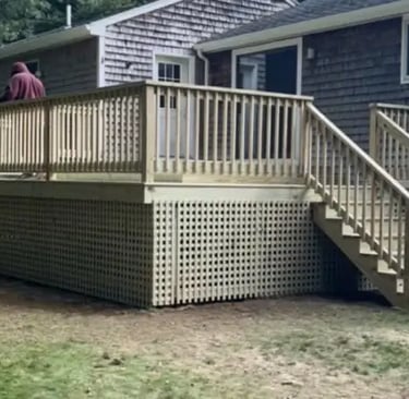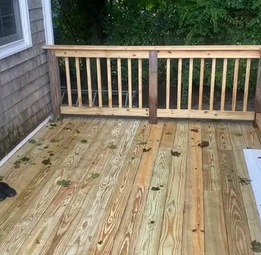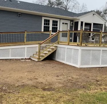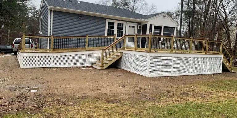 If replacing a deck, we remove the old structure and install proper footings, posts, and supports to meet Massachusetts building code.